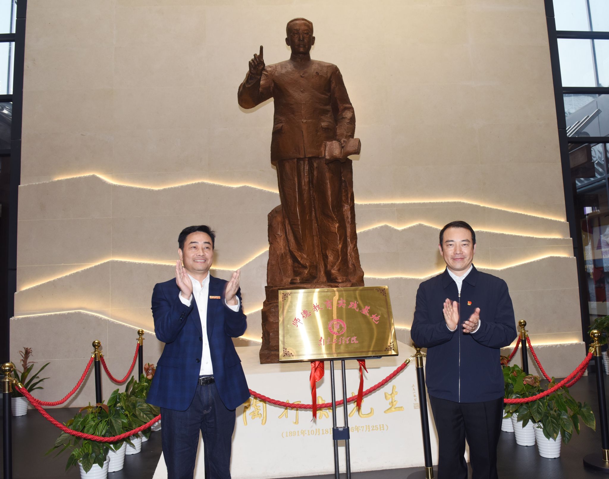在师德教育馆内中央大厅陶行知先生的雕像前,孙爱武与张志华共同为师德教育实践基地揭牌。
