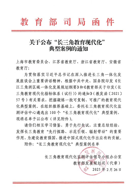 2月26日,教育部公布“长三角教育现代化”典型案例,我校报送的“‘两接两提’培养区域产业急需应用创新人才”案例成功入选。本次全国共遴选出典型案例100个,这是我校在国家级教学典型案例上取得的又一突破。