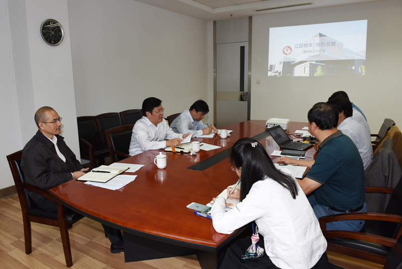 在五楼会议室,图书馆白少布馆长以“立足根本,特色发展”为题,从图书馆的基本情况、工作现状、存在的不足以及下一步工作思路等方面做了汇报,与会馆领导也就各自分管工作做了简要汇报。