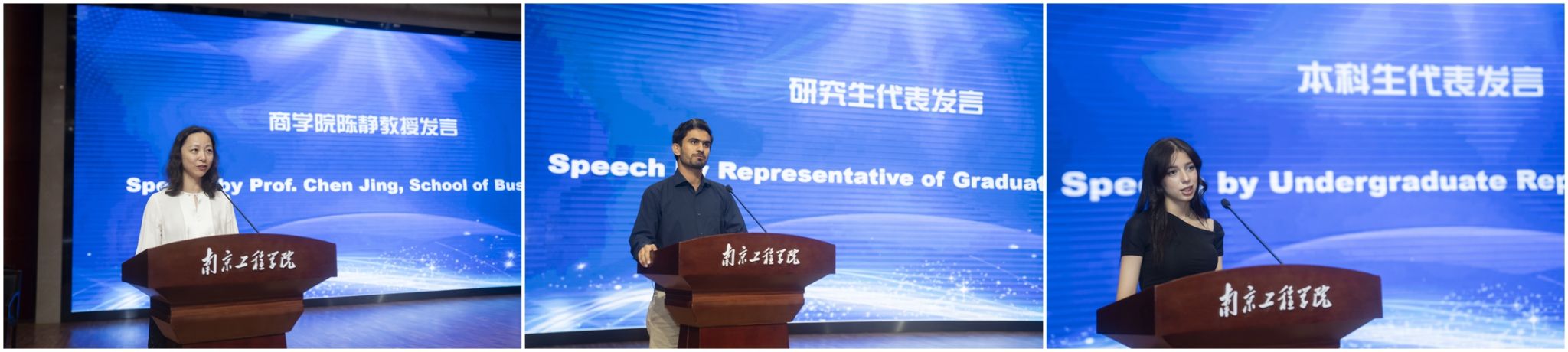 教师代表、商学院陈静向2024级新同学表示热烈欢迎,勉励同学们学会与来自不同文化背景的人相处,敢于尝试、勇于探索,积极参与各类实习和社会实践。研究生新生代表Anss、本科生新生代表Nihad在发言中表示,将努力钻研专业知识,深度感知中国文化,培养跨文化交际能力,在南工程实现自己的人生理想。