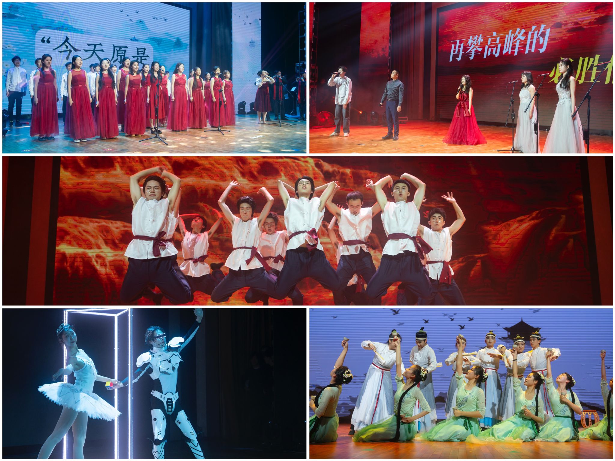 联欢会由“山河序曲”“东方华章”“矢志登峰”“同心筑梦”四个篇章组成。校领导班子带来小合唱《没有共产党就没有新中国》,歌声慷慨激昂,表达了对党的热爱和带领全校师生员工迈向美好未来的信心。