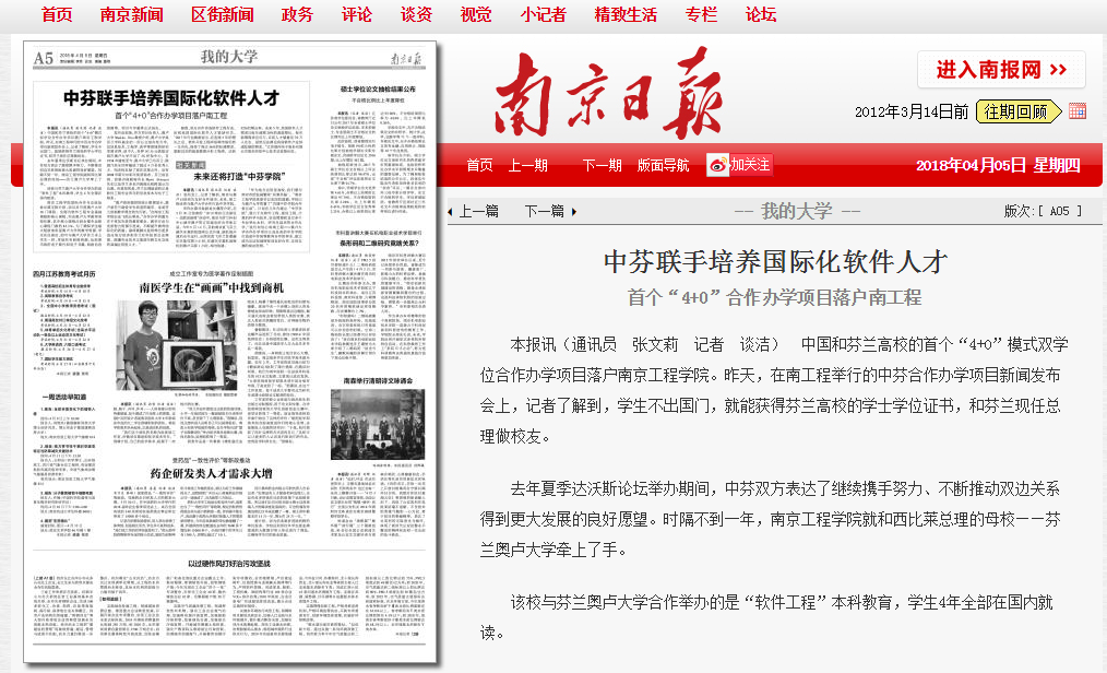 本报讯(通讯员 张文莉 记者 谈洁) 中国和芬兰高校的首个“4+0”模式双学位合作办学项目落户凯发k8官网。昨天,在南工程举行的中芬合作办学项目新闻发布会上,记者了解到,学生不出国门,就能获得芬兰高校的学士学位证书,和芬兰现任总理做校友。