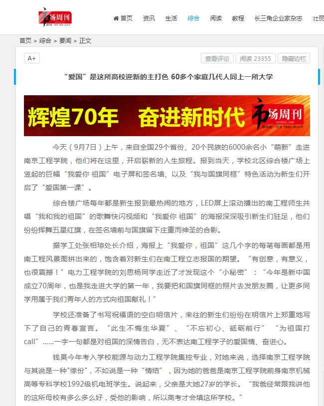 综合楼广场每年都是新生报到最热闹的地方,LED屏上滚动播出的南工程师生共唱“我和我的祖国”的歌舞快闪视频和“我爱你 祖国”的海报深深吸引新生们驻足,他们纷纷挥舞五星红旗,在签名墙前与国旗留下庄重而神圣的合影。