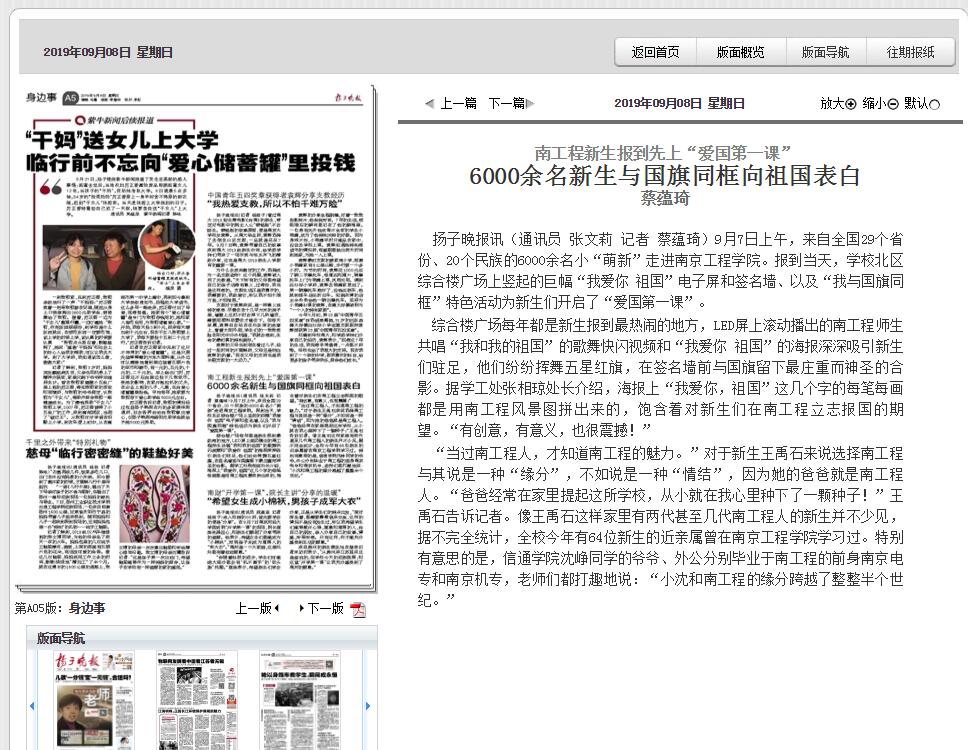 《扬子晚报》:南工程新生报到先上“爱国第一课” 6000余名新生与国旗同框向祖国表白