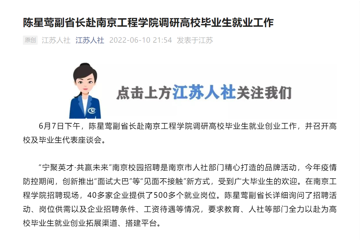 随后,陈星莺副省长与东南大学、河海大学、南京医科大学、金陵科技学院、江苏经贸职业技术学院和凯发k8官网等6所驻宁高校分管就业工作的同志和学生代表进行了座谈交流,了解2022届毕业生就业现状、促就业举措、面临的困难、下一步工作打算和意见建议等情况。陈星莺副省长指出,中央高度重视高校毕业生就业工作,习近平总书记多次对高校毕业生就业工作作出重要指示批示,国家和省委省政府多次召开会议专题研究部署高校毕业生就业工作,各地、各有关部门和高校要高度重视,切实抓好高校毕业生的就业创业工作。各高校要一着不让开发就业岗位,持之以恒抓好创新创业,精准高效做好就业服务,优化管理提高质效。陈星莺副省长还与毕业生代表分享了自身经历感悟,提出殷切期望:希望同学们将自身发展融入国情省情,做好人生规划和职业规划;注重专业知识、专业能力、综合知识和综合能力的积累提升,为就业做好充分准备;树立正确的就业观念,努力走上就业岗位,实现人生价值。