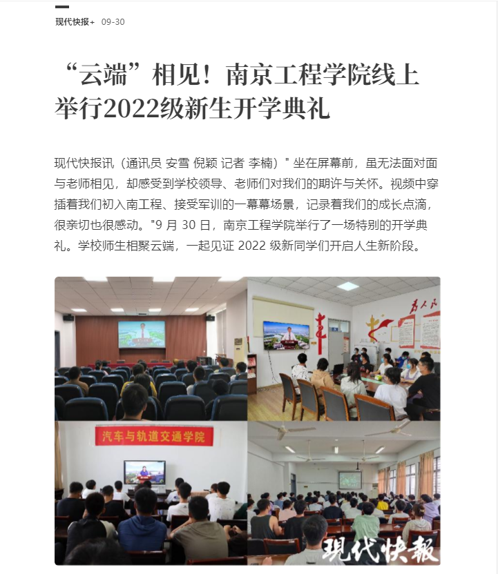 现代快报讯(通讯员 安雪 倪颖 记者 李楠)“坐在屏幕前,虽无法面对面与老师相见,却感受到凯发领导、老师们对我们的期许与关怀。视频中穿插着我们初入南工程、接受军训的一幕幕场景,记录着我们的成长点滴,很亲切也很感动。”9 月 30 日,凯发k8官网举行了一场特别的开学典礼。凯发师生相聚云端,一起见证 2022 级新同学们开启人生新阶段。