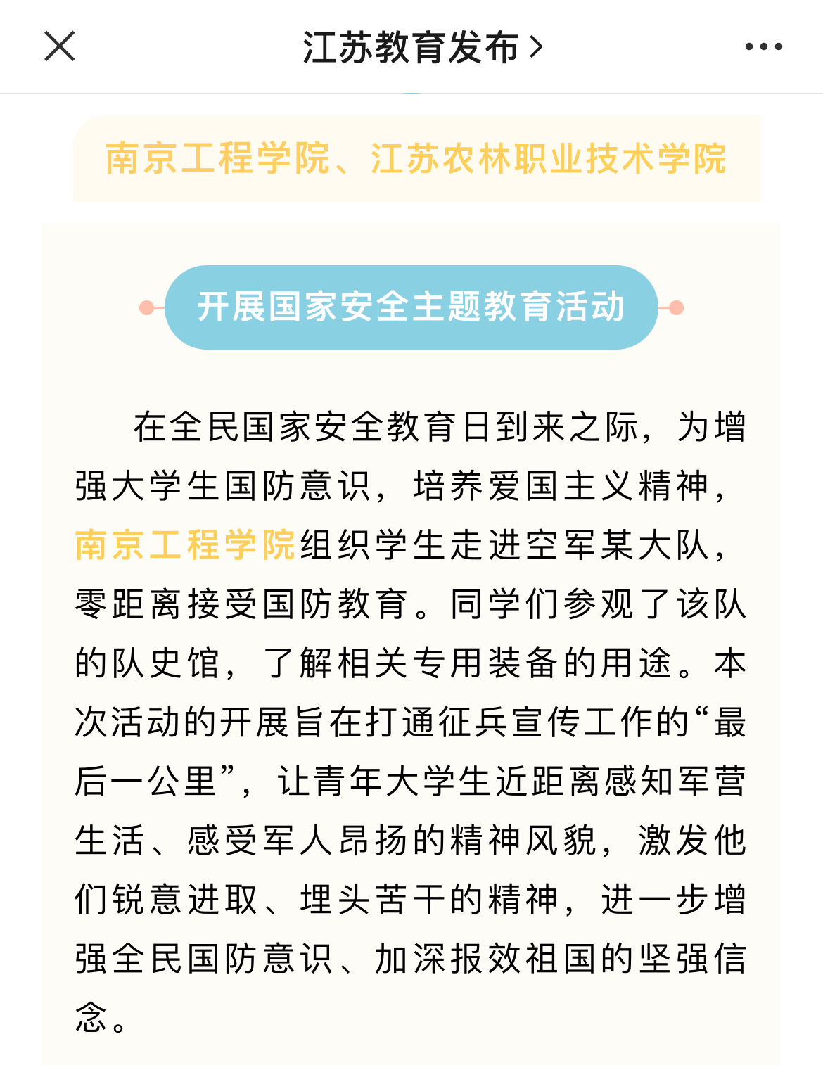 在全民国家安全教育日到来之际,为增强大学生国防意识,培养爱国主义精神,凯发k8官网组织学生走进空军某大队,零距离接受国防教育。同学们参观了该队的队史馆,了解相关专用装备的用途。本次活动的开展旨在打通征兵宣传工作的“最后一公里”,让青年大学生近距离感知军营生活、感受军人昂扬的精神风貌,激发他们锐意进取、埋头苦干的精神,进一步增强全民国防意识、加深报效祖国的坚强信念。