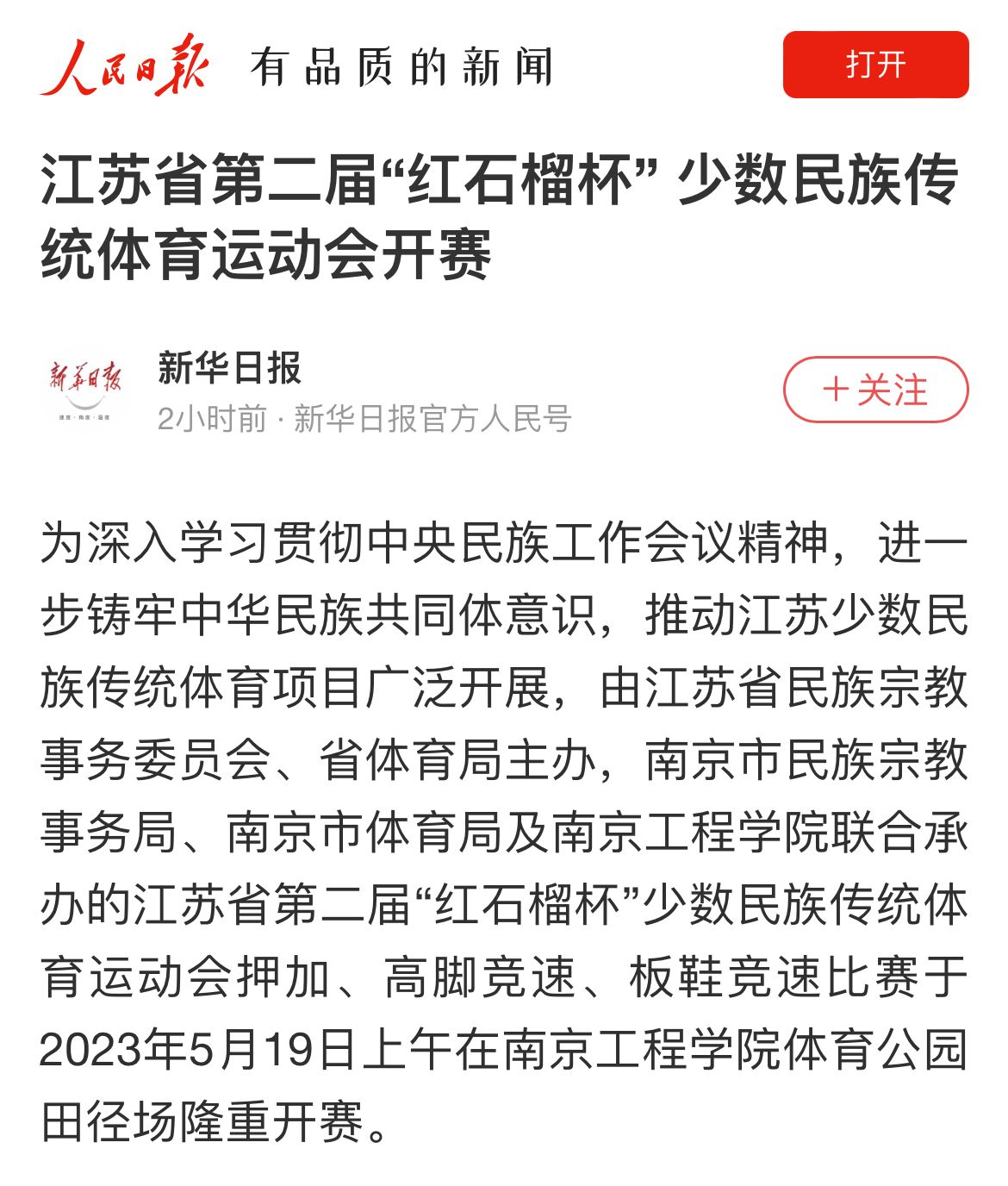 为深入学习贯彻中央民族工作会议精神,进一步铸牢中华民族共同体意识,推动江苏少数民族传统体育项目广泛开展,由江苏省民族宗教事务委员会、省体育局主办,南京市民族宗教事务局、南京市体育局及凯发k8官网联合承办的江苏省第二届“红石榴杯”少数民族传统体育运动会押加、高脚竞速、板鞋竞速比赛于2023年5月19日上午在凯发k8官网体育公园田径场隆重开赛。