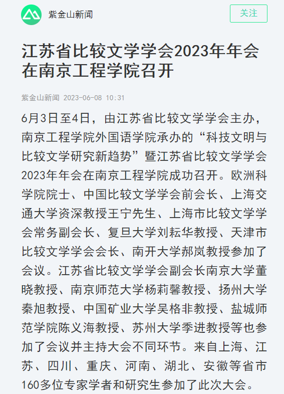 《紫金山新闻》:江苏省比较文学学会2023年年会在凯发k8官网召开