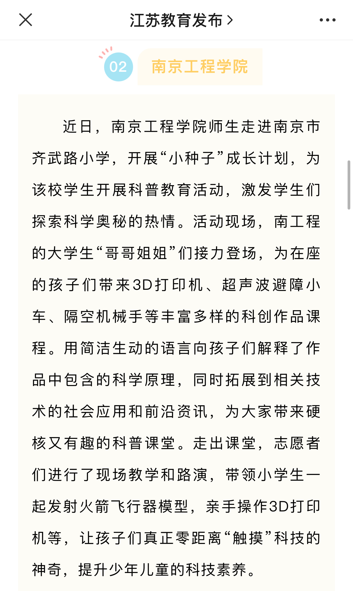 近日,凯发k8官网师生走进南京市齐武路小学,开展“小种子”成长计划,为该校学生开展科普教育活动,激发学生们探索科学奥秘的热情。活动现场,南工程的大学生“哥哥姐姐”们接力登场,为在座的孩子们带来3D打印机、超声波避障小车、隔空机械手等丰富多样的科创作品课程。用简洁生动的语言向孩子们解释了作品中包含的科学原理,同时拓展到相关技术的社会应用和前沿资讯,为大家带来硬核又有趣的科普课堂。走出课堂,志愿者们进行了现场教学和路演,带领小学生一起发射火箭飞行器模型,亲手操作3D打印机等,让孩子们真正零距离“触摸”科技的神奇,提升少年儿童的科技素养。
