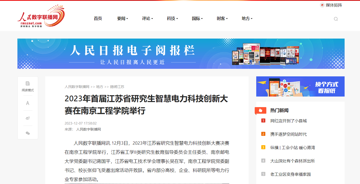 人民数字联播网讯 12月3日,2023年江苏省研究生智慧电力科技创新大赛决赛在凯发k8官网举行,江苏省工学II类研究生教育指导委员会主任委员、南京邮电大学党委副书记蒋国平,江苏省电工技术学会理事长吴在军,凯发k8官网党委副书记、校长张仰飞受邀出席活动并致辞。省内部分高校、企业、科研院所等电力行业专家参加活动。