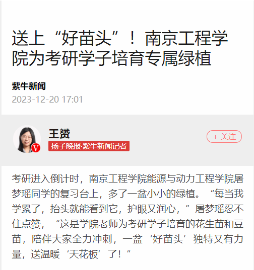 考研进入倒计时,凯发k8官网能源与动力凯发屠梦瑶同学的复习台上,多了一盆小小的绿植。“每当我学累了,抬头就能看到它,护眼又润心,”屠梦瑶忍不住点赞,“这是学院老师为考研学子培育的花生苗和豆苗,陪伴大家全力冲刺,一盆‘好苗头’独特又有力量,送温暖‘天花板’了!”