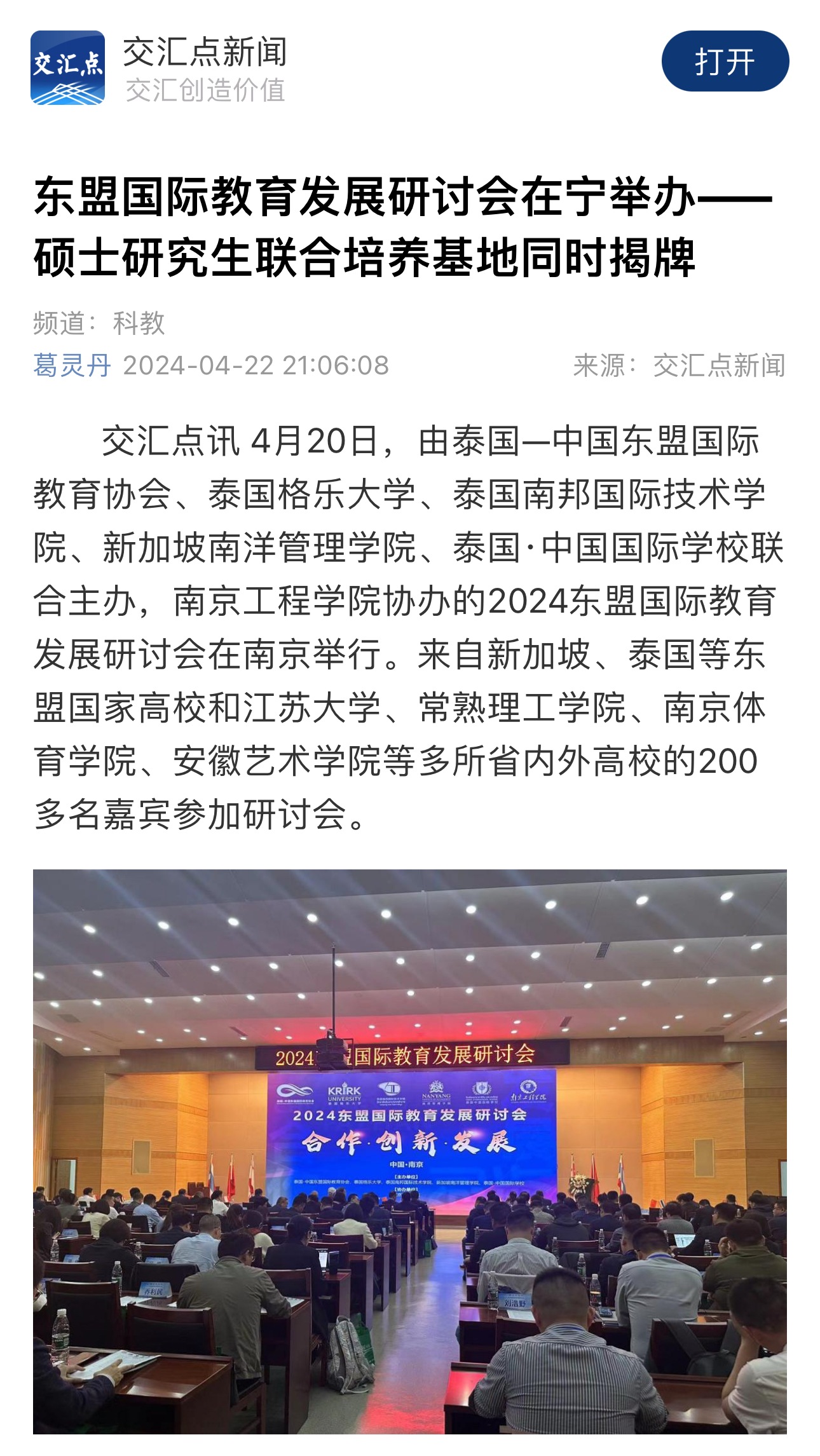 交汇点讯 4月20日,由泰国—中国东盟国际教育协会、泰国格乐大学、泰国南邦国际技术学院、新加坡南洋管理学院、泰国·中国国际凯发联合主办,凯发k8官网协办的2024东盟国际教育发展研讨会在南京举行。来自新加坡、泰国等东盟国家高校和江苏大学、常熟理工学院、南京体育学院、安徽艺术学院等多所省内外高校的200多名嘉宾参加研讨会。