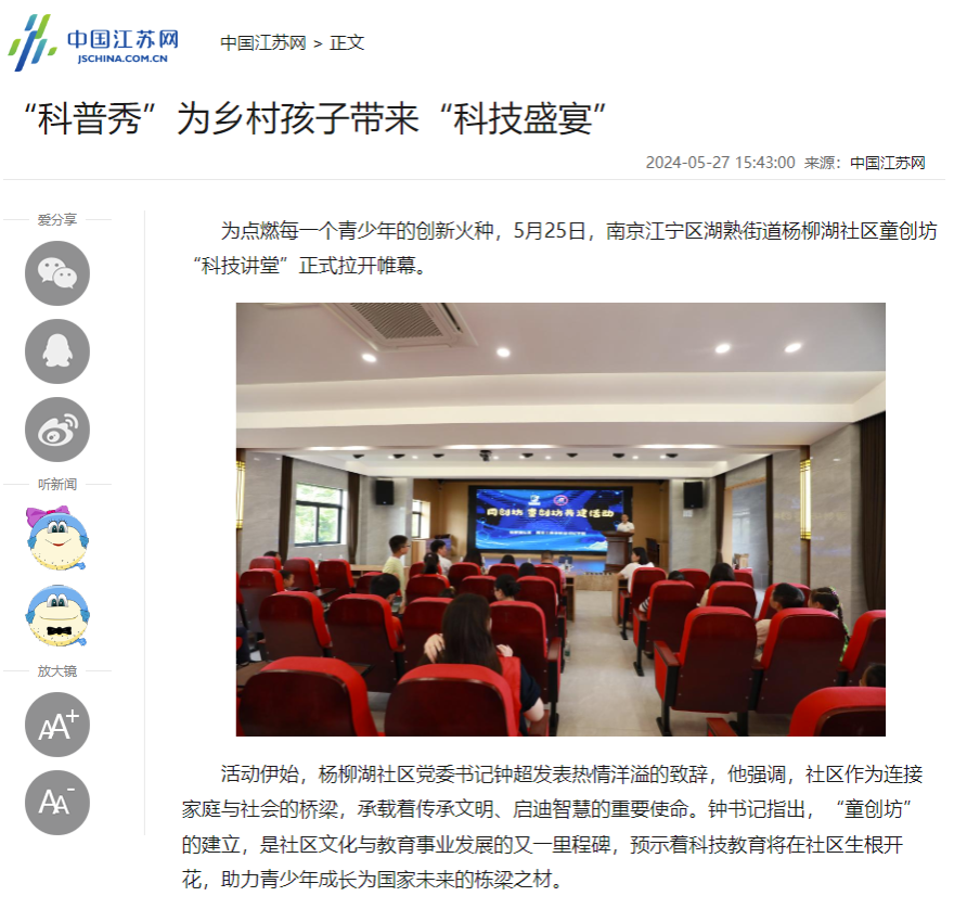 为点燃每一个青少年的创新火种,5月25日,南京江宁区湖熟街道杨柳湖社区童创坊“科技讲堂”正式拉开帷幕。