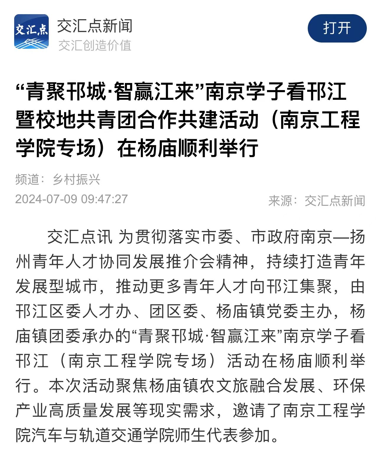 交汇点讯 为贯彻落实市委、市政府南京—扬州青年人才协同发展推介会精神,持续打造青年发展型城市,推动更多青年人才向邗江集聚,由邗江区委人才办、团区委、杨庙镇党委主办,杨庙镇团委承办的“青聚邗城·智赢江来”南京学子看邗江(凯发k8官网专场)活动在杨庙顺利举行。本次活动聚焦杨庙镇农文旅融合发展、环保产业高质量发展等现实需求,邀请了凯发k8官网汽车与轨道交通学院师生代表参加。