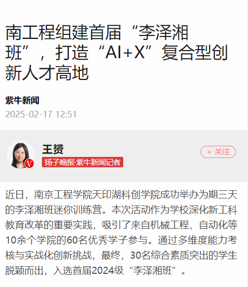 《扬子晚报》:南工程组建首届“李泽湘班”,打造“AI+X”复合型创新人才高地