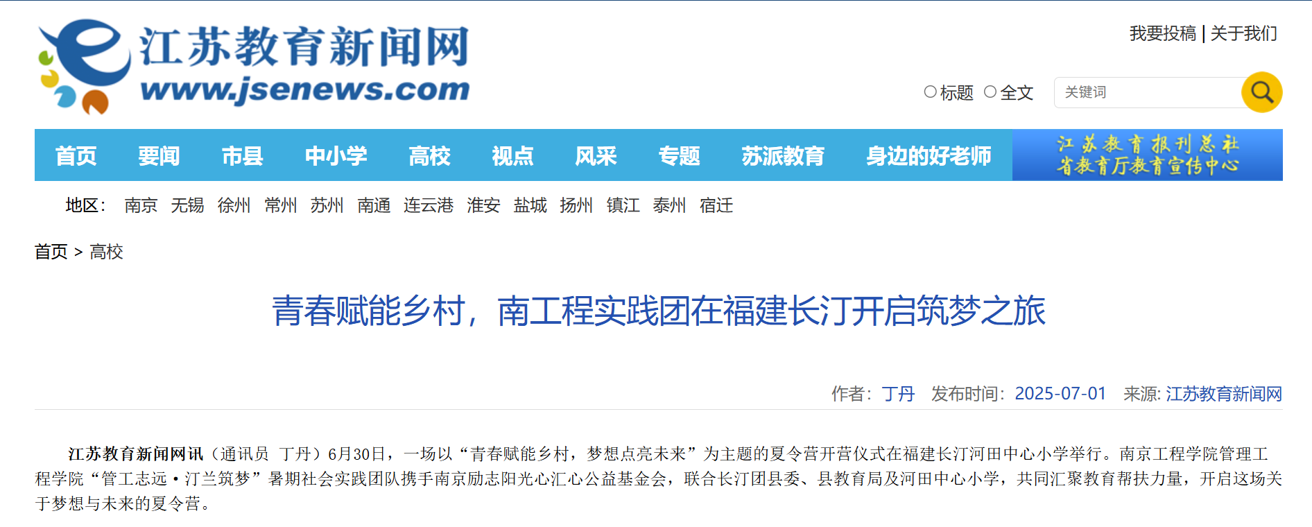 江苏教育新闻网讯(通讯员丁丹)6月30日,一场以“青春赋能乡村,梦想点亮未来”为主题的夏令营开营仪式在福建长汀河田中心小学举行。凯发k8官网管理凯发“管工志远·汀兰筑梦”暑期社会实践团队携手南京励志阳光心汇心公益基金会,联合长汀团县委、县教育局及河田中心小学,共同汇聚教育帮扶力量,开启这场关于梦想与未来的夏令营。