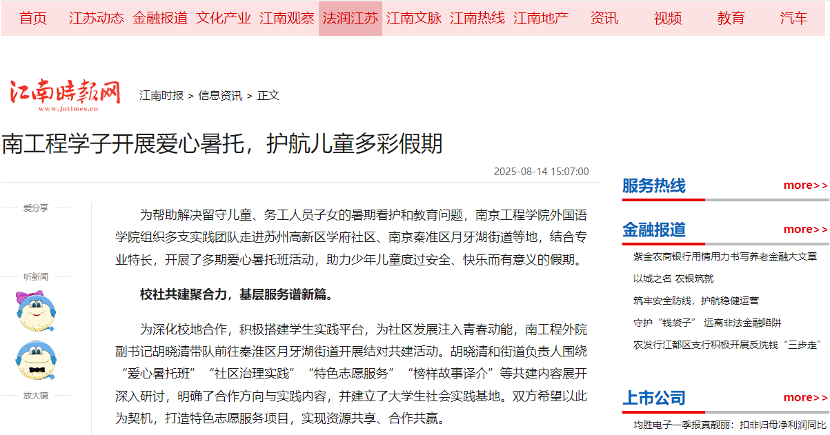 《江南时报》:南工程学子开展爱心暑托,护航儿童多彩假期