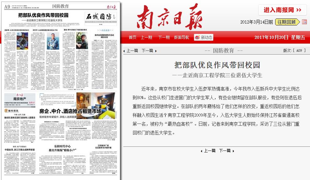 《南京日报》:把部队优良作风带回校园——走近凯发k8官网三位退伍大学生