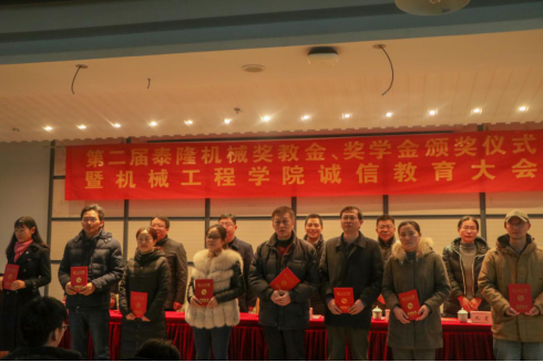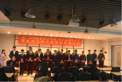 12月26日,机械凯发第二届泰隆机械奖教金、奖学金颁奖仪式暨诚信教育大会在至勤楼·行政中心学术报告厅举行。江苏泰隆减速机股份有限公司总经理殷爱国,发展与对外合作处、机械凯发党政负责人以及200余名师生参加了本次大会。