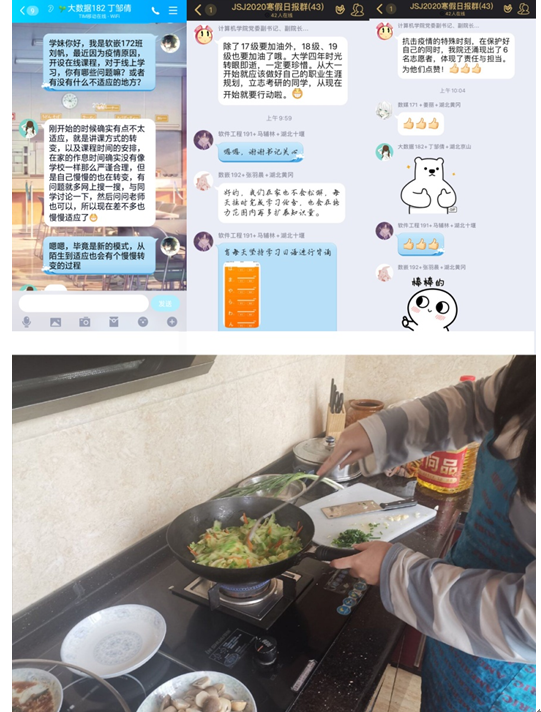 疫情发生以来,该院湖北籍学生成为了老师和同学们心头最深的牵挂。该院学工办全体老师认真做好湖北籍学生关心关爱工作,扎实做到“资助帮扶到位、学习支持到位、情况沟通到位、关心关怀到位、心理关爱到位”,该院28名滞留湖北学生成立临时团支部,刘艳华副书记多次在群里关心询问同学们的生活和学习情况,鼓励大家坚定信心、静待开学。这支“特殊”的团支部还开展了“宅家大作战,美食云分享”活动,传递积极、乐观和健康的理念。该院学生党支部还自发开展了“党员一对一”结对关怀活动,每名学生党员结对一名滞留湖北的学生,就在线学习、就业等问题开展“云互动”,还相约“云上”健身打卡,增强战胜疫情的信心和决心。