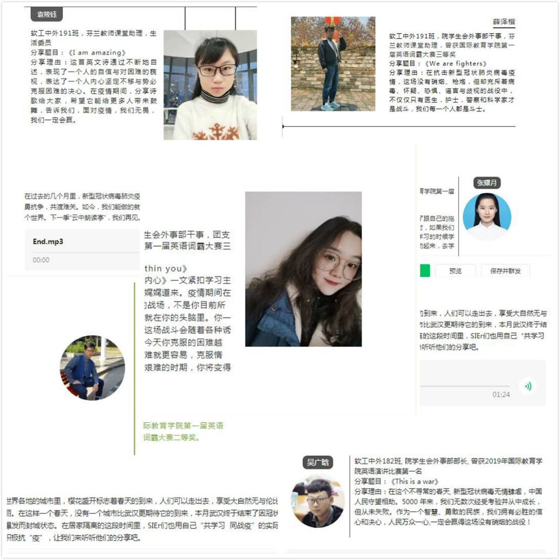 在首期“云中朗读亭”活动中,该院学子采用英文演讲的形式分享自己抗疫期间的感悟,也表达了全世界人民众志成城、抗击疫情的信心和决心。软工中外182班吴广晗分享的题目是《This is a war》,他说,中华民族在磨难中成长,但从未放弃,作为一个智慧、勇敢的民族,我们拥有必胜的信心和决心,一定会赢得这场没有硝烟的战役。软工中外192班顾一涵的《Look within you》、软工中外182韩旭东的《Strive to be the best version of yourself》紧扣居家学习的主题,鼓励大家克服惰性,加强自律,共渡难关,变得更加强大。软工中外191班的袁筱钰带来诗歌《I am amazing》,表达了一个人内心坚定不移与势必克服困难的决心。为修身励志而读书,为文明传承而读书,为振兴中华而读书,在这样一个特殊的时期,“云中朗读亭”点燃了同学们的阅读激情,激励大家与好书为伴,共同成长进步。