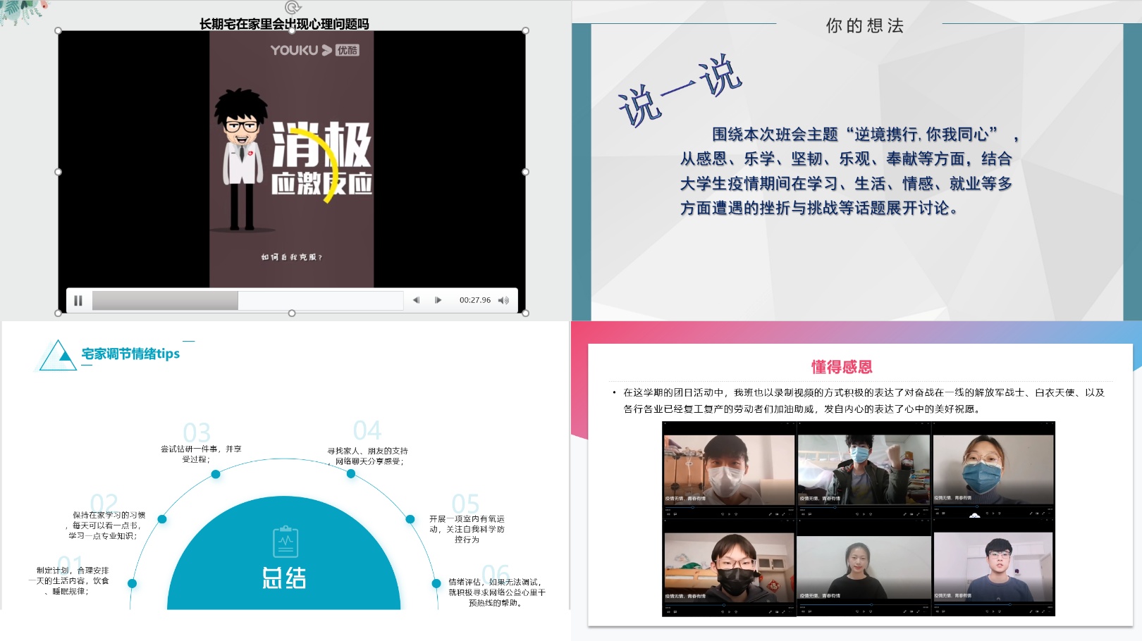 为进一步加强对学生的心理疏导,保障大学生的身心健康,该院组织各班级利用腾讯会议、QQ群课堂等新媒体平台开展了心理健康主题云班会,“屏对屏、面对面、心连心”确保心理教育不掉线。全院各班级围绕线上学习、居家生活、情绪调节等三个方面展开,就“如何缓解疫情期间的网课焦虑”“如何正确面对和处理家庭关系”等问题进行探讨,在交流中纾解苦闷,为心灵减负。各班心理委员精心准备了一系列游戏互动环节,以心理小测试、你画我猜、观看影片等活动帮助同学们舒缓焦虑情绪,减轻心理压力。学院党委副书记兼副院长刘艳华老师寄语同学们要学会自我情绪管理和自我心理调节,学会正确进行心理战“疫”,在磨炼中塑造自立自强的人格品质,在报效祖国的时代大潮中谱写无悔青春。