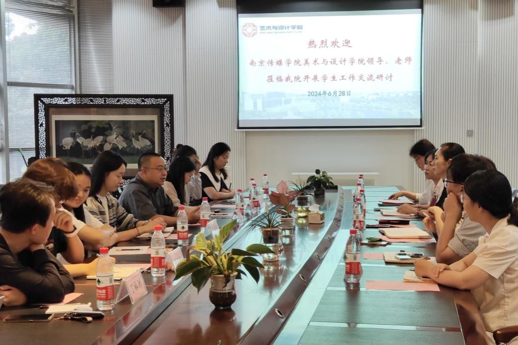 6月28日,南京传媒学院美术与设计学院党总支书记王宝宁带领学工队伍莅临艺术与设计学院开展学生工作交流研讨,学院党委书记王雪飞、党委副书记胡晓清热情接待了来宾并开展座谈。