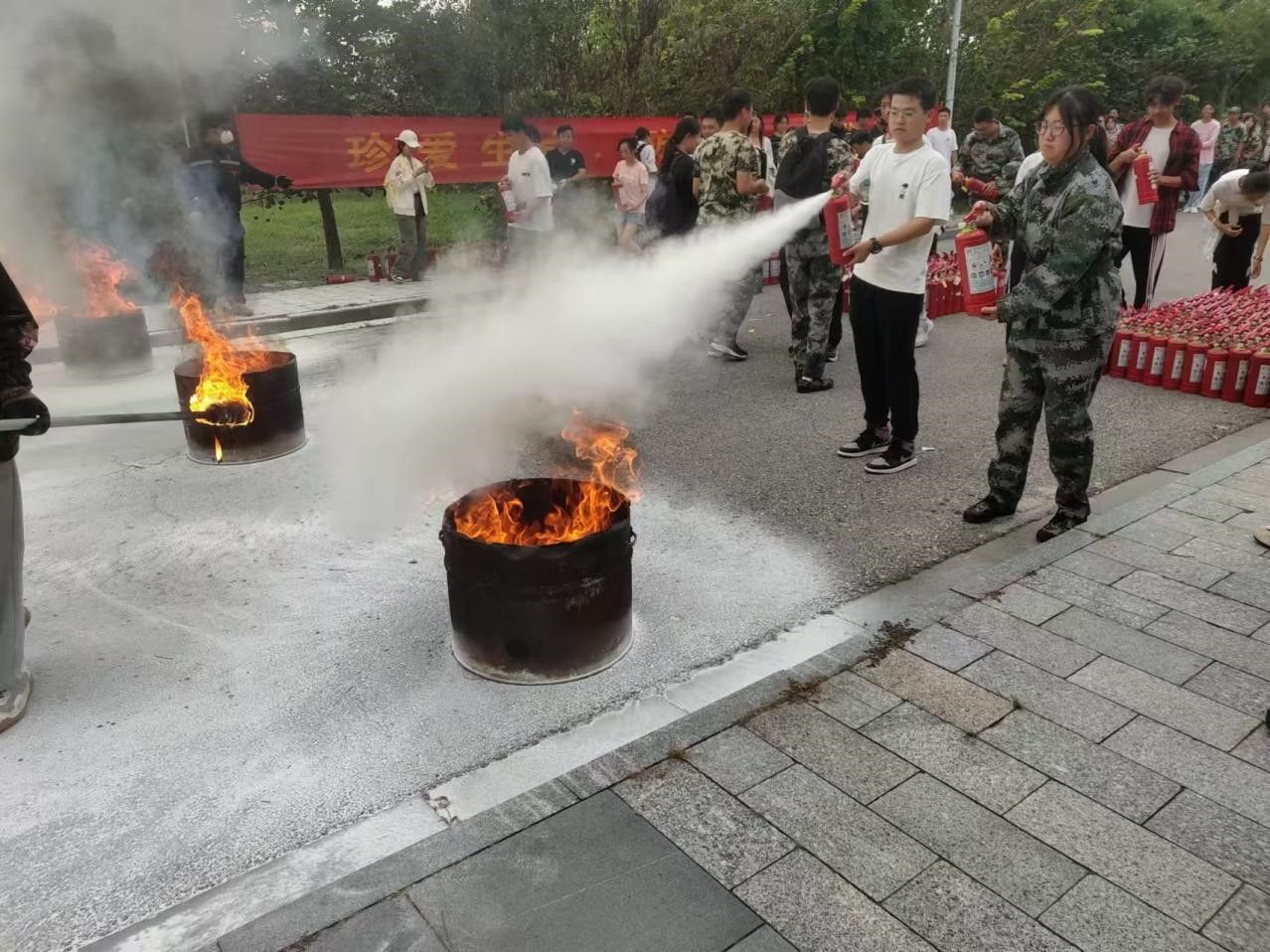 本次消防演练由消防应急疏散演练和消防灭火演练两部分组成。消防应急疏散演练模拟学生食堂突发火情。保卫处工作人员按照预案点燃烟雾弹,实景模拟火场。随着消防警铃响起,参训新生用湿毛巾捂住口鼻,弯腰低姿,有秩序地沿安全路线“逃生”至户外,整个疏散过程迅速有序,显示出了良好的组织纪律性和团队协作能力。在消防灭火演练现场,保卫处老师详细说明了初起火灾的灭火要领、灭火器的使用方法和适用范围,并现场演示了灭火过程。600多名参训师生在工作人员的指导下,分组进行实操训练,用灭火器扑灭火桶中熊熊燃烧的火焰,初步掌握了灭火器的使用方法。
