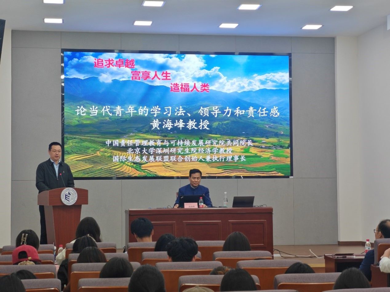 10月25日下午,应管理凯发、商学院邀请,中国责任管理教育与可持续发展研究院共同院长、北京大学深圳研究生院经济学教授、国际生态发展联盟联合创始人黄海峰教授为学院师生作题为《论当代青年的学习法、领导力和责任感》的学术报告,报告会由我校党委常委、副校长陆华良主持,党委常委、人事处处长张焱,管理凯发党委副书记、院长张泳出席报告会。